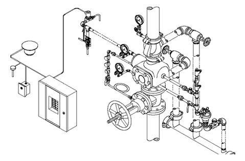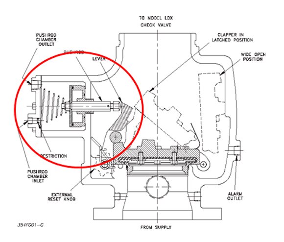 In condizioni operative, questa camera viene alimentata e mantenuta in pressione d’acqua tramite il trim della valvola. Sul trim viene installato un attuatore pneumatico a tre vie, una porta collegata al trim in pressione d’acqua, una collegata con l’aria immessa nella rete sprinkler e l’altra ad uno scarico. Con la rottura di uno sprinkler la pressione dell’aria viene a mancare e l’attuatore, attivandosi, depressurizza il volume d’acqua all’interno del trim mandandola in scarico generando una depressione della camera differenziale liberando così