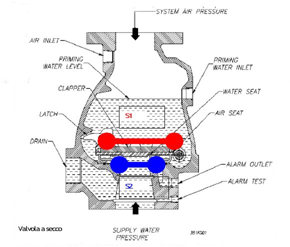 La minor quantità d’aria contenuta nei sistemi a preazione in confronto ai sistemi a secco è dovuta al modo in cui la valvola di allarme viene armata. Nei sistemi a secco l’aria immessa a valle della valvola di allarme deve agire direttamente sul clapet e vincere la pressione dell’acqua a monte per riuscire chiudere il piattello.